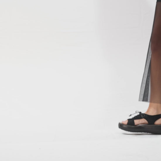 The BETH sandal in black pony skin is a model created for those who want a minimalist shoe yet full of personality. The black calfskin structure, enriched by laces that embrace the foot and elastic for greater comfort, creates a balance between clean aesthetics and everyday style.